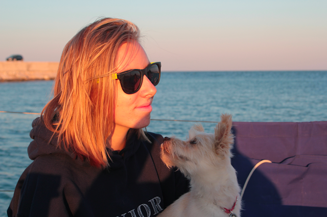 After some lively renditions of sea chanties (well, Sloop John B, What shall We Do With a Drunken Sailor and others), which Greg joined in on solidly because his mother taught them all to him, the Italiano ladies eventually departed for massage work and the trip back to Rome. Around 6 PM we got a wonderful surprise from Greg: he came back and took us out on the open sea, a thrill on a boat like that, and we spent a couple of hours pitching in (Dian was given the privilege and responsibility of the tiller and did a stellar job) and just enjoying the gently rolling sea and the sunset light fading to gorgeous colors over the horizon.